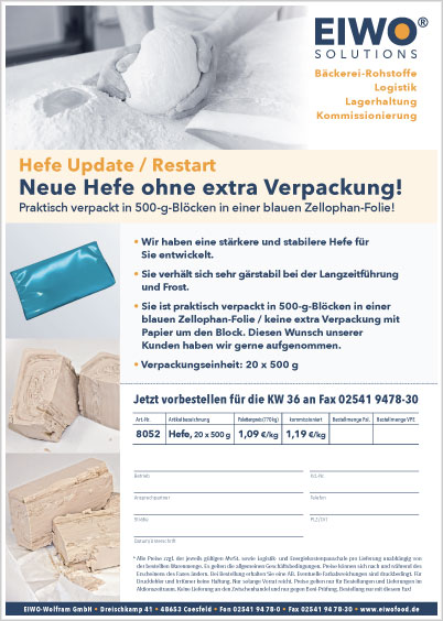 Unsere neue Hefe ohne extra Verpackung. Praktisch verpackt in 500-g-Blöcken in einer blauen Zellophan-Folie.