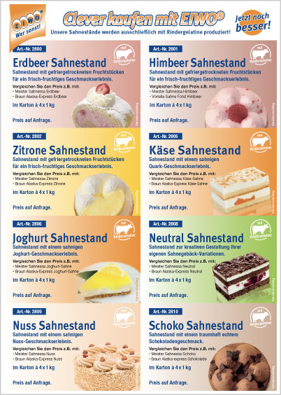 Unsere Sahnestände gibt es jetzt mit verbesserter Rezeptur. Sie werden ausschließlich mit Rindergelatine produziert und glänzen in Qualität und Preis.